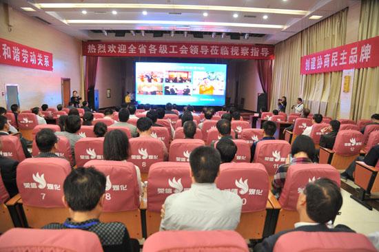 馮慶祿一行參觀了生產廠區(qū),對我公司的規(guī)范生產、高效管理、文化積淀、廠區(qū)環(huán)境和員工素質給予高度贊揚。隨后,與會人員來到職工之家觀看了企業(yè)文化圖片展,參觀了職工乒乓球室、職工書屋、職工健身房、職工超市等,查閱了公司工資集體協(xié)商文書記錄檔案,最后來到多功能廳觀看了公司題為“積極主動協(xié)商 真情善待員工 構建和諧幸福榮信”的多媒體工作匯報。通過現(xiàn)場參觀、實地查看和聽取匯報,與會人員一致認為,榮信煤化積極主動進行工資集體協(xié)商成效顯著,推動了協(xié)商共謀、機制共建、效益共創(chuàng)、利益共享,為構建和諧幸福榮信打下了良好的基礎。公司構建和諧幸福榮信的做法內涵豐富,成效扎實,公司依靠員工辦企業(yè),依法維權、構建和諧,形成了良好的勞資關系、勞動關系。通過發(fā)揮工會作用、暢通民主管理主渠道、履行工會維護的職能、開展寓教于樂的活動、建設企業(yè)文化等,員工的積極性、創(chuàng)造性充分調動起來,增強了企業(yè)的凝聚力、向心力,實現(xiàn)了職工體面勞動、舒心工作、快樂生活,企業(yè)長遠健康發(fā)展互惠共贏的良好局面。
